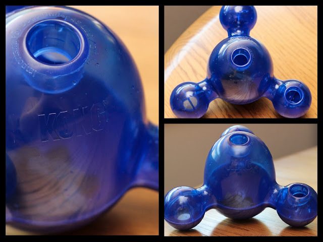 The one downside to this toy is that it is a bit time consuming to fill with kibble and treats. Unlike the Kong Wobbler, the Satellite doesn't unscrew for easy kibble filling (one of the best features of the Kong Wobbler in my opinion). I find myself plopping small bits of kibble into the toy at a time which can be annoying if I'm in a hurry to feed Athena her breakfast. Also, I wouldn't recommend this toy for dogs who are known for chewing up their plastic toys. I can see the protruding ends being quite tempting to some of those power chewers out there.